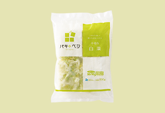 約4~5㎜幅で千切りした白菜を4分割に割れるようにスリットを入れブロック凍結をしました。折れが少なく、解凍してお召し上がり頂けますので大変便利です。