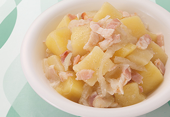 じゃがいもにたまねぎ、ベーコンを加えスパイスを利かせて仕上げました。袋のままボイルするだけでご利用いただけますので忙しい時、人手の少ない時等に最適です。